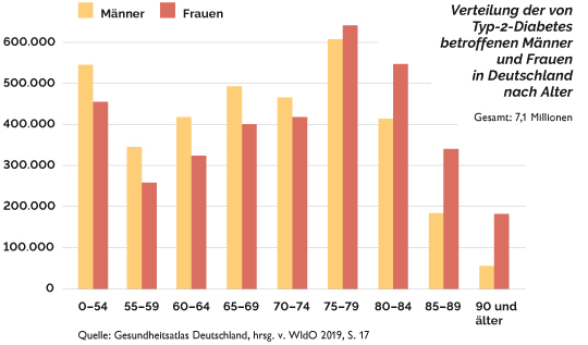 In der traurigen Länder-Hitliste steht Deutschland auf Platz 7, jeder Zehnte ist hier daran erkrankt. Und die Prognose sieht düster aus: Eine aktuelle Studie des Deutschen Diabetes Zentrums (DDZ) und des Robert Koch-Instituts (RKI) stellt in Aussicht, dass es 2040 bis zu zwölf Millionen Menschen sein könnten, also ein Anstieg um 50 Prozent. In Köln waren es nach einer Schätzung der AOK Rheinland 2017 etwas mehr als 7 Prozent, das macht 78.000 Kölnerinnen und Kölner. Mehr die Hälfte sind älter als siebzig.