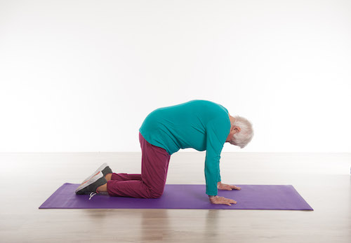 Vorbereitung: Begeben Sie sich in den Vierfüßler-Stand. Die Arme zeigen senkrecht von der Schulter zum Boden, und die Oberschenkel bilden eine senkrechte Linie von der Hüfte nach unten.