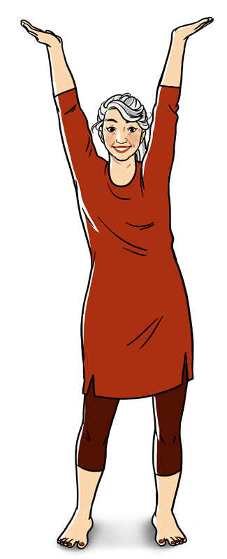1. Die Körperseiten streckenMobilisiert den Rumpf, Körperseite, Arme und Schultern Stellen Sie sich hüftbreit auf und strecken Sie Ihre Arme hoch. Die Hände werden dabei angewinkelt, die Handflächen zeigen nach oben. Dann schieben Sie eine Hand weiter nach oben, die andere bleibt zurück. Die jeweilige Körperseite wird dabei gestreckt. 10–20 Wiederholungen pro Seite |