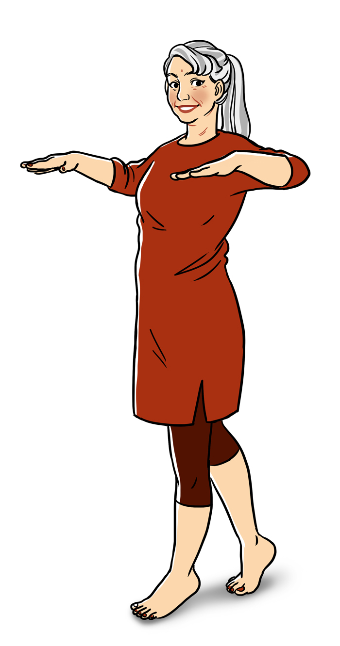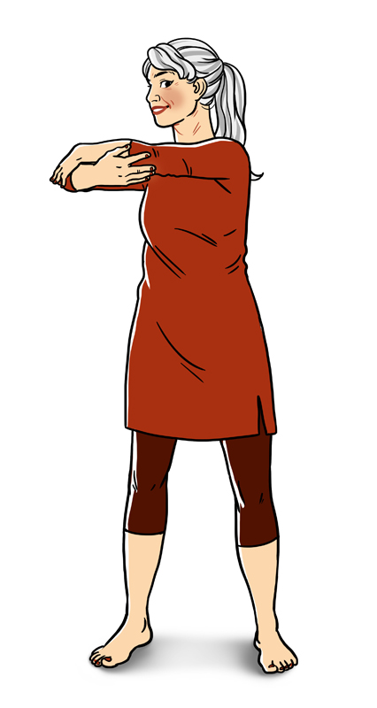 6. Die Mobilität im Oberkörper fördernFördert Rumpf- und Rückenbeweglichkeit Legen Sie Ihre Arme in Schulterhöhe übereinander. Die Beine stehen hüftbreit, die Schultern bleiben gesenkt. Nun drehen Sie Ihren Rumpf langsam zur einen, dann zur anderen Seite. Bei dieser Übung ist es wichtig, dass Ihr Becken der Bewegung nicht folgt, sondern stabil in der Mitte bleibt. 10–20 Wiederholungen pro Seite |