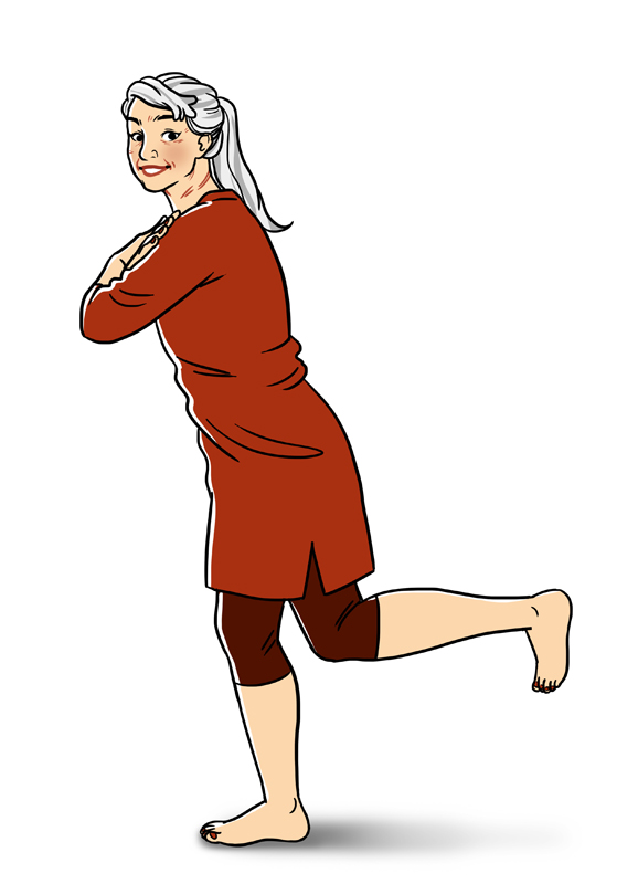 4. Die Körperrückseite trainierenStärkt das Gleichgewicht und festigt Po und Beinrückseite Kreuzen Sie Ihre Arme vor der Brust. Neigen Sie dann Ihren Oberkörper leicht vor und heben Sie ein Bein nach hinten an. Seine Fußspitze fest anwinkeln. Schieben Sie nun die Fußsohle des gebeugten Beines nach hinten und wieder vor, der Unterschenkel ist dabei parallel zum Boden. Halten Sie Ihre Hüftknochen gerade. 10–20 Wiederholungen pro Bein |