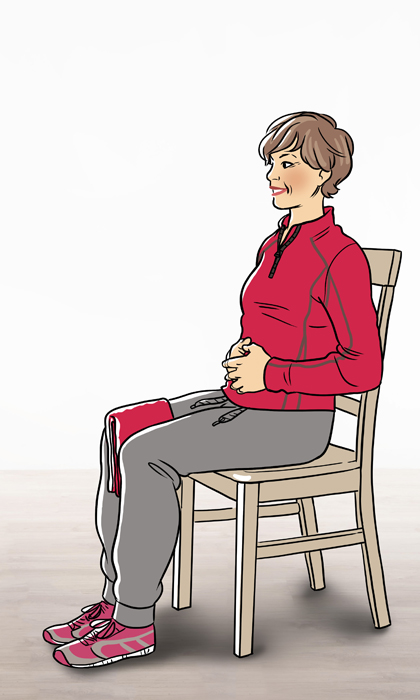 Setzen Sie sich auf einen Stuhl. Führen Sie ein Kissen oder ein gefaltetes Handtuch zwischen Ihre Knie. Dann pressen Sie sie vorsichtig zusammen und halten den Druck. Führen Sie Ihre Hände dabei auf den Bauch und richten Sie Ihren Oberkörper weit nach oben auf.
