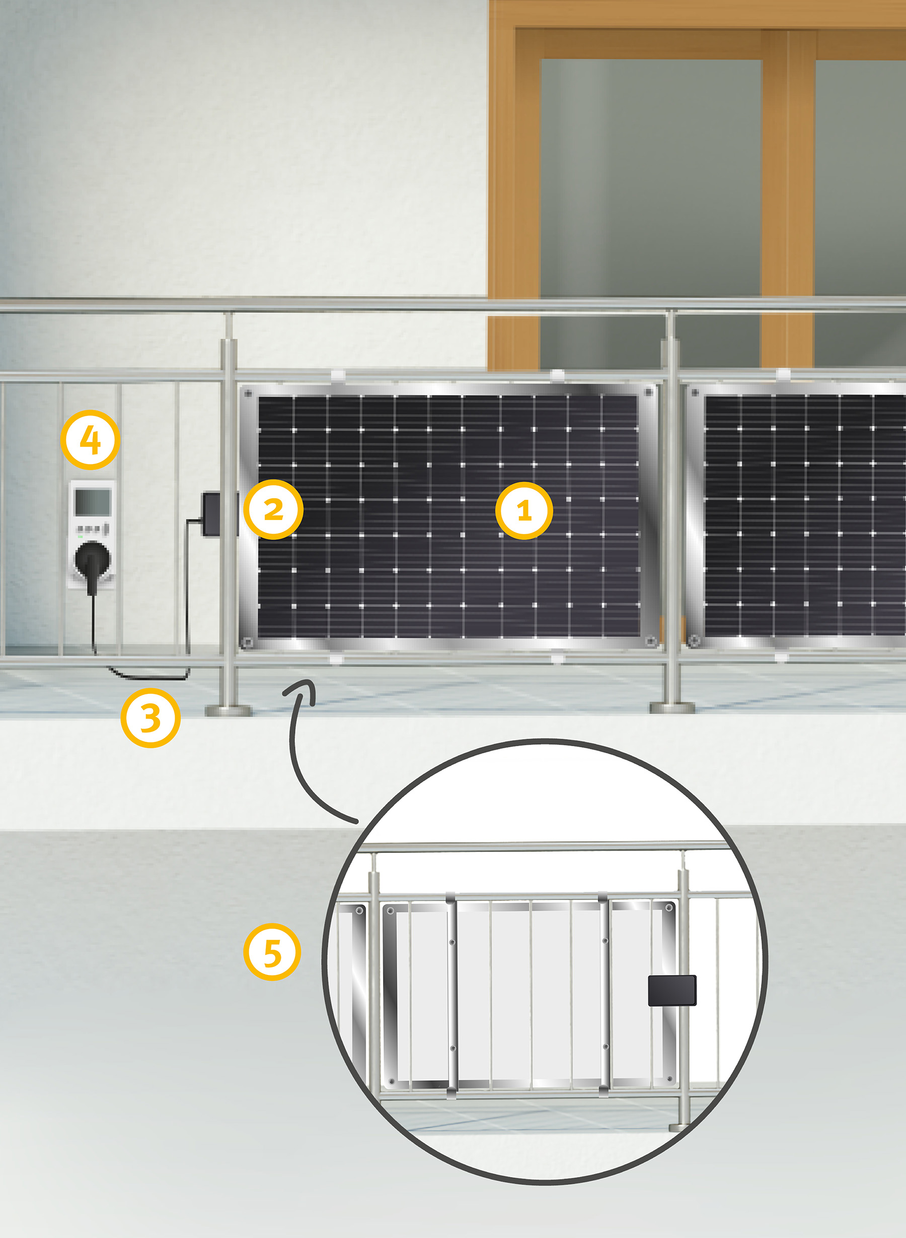 Ein Stecker-Solargerät besteht aus ein bis zwei Solarmodulen. Ein Modul hat circa 300 Watt Nennleistung, ist etwa 1 x 1,70 Meter groß und wiegt bis zu 20 Kilogramm. Manche Systeme bestehen auch aus mehreren kleineren Modulen.