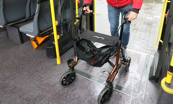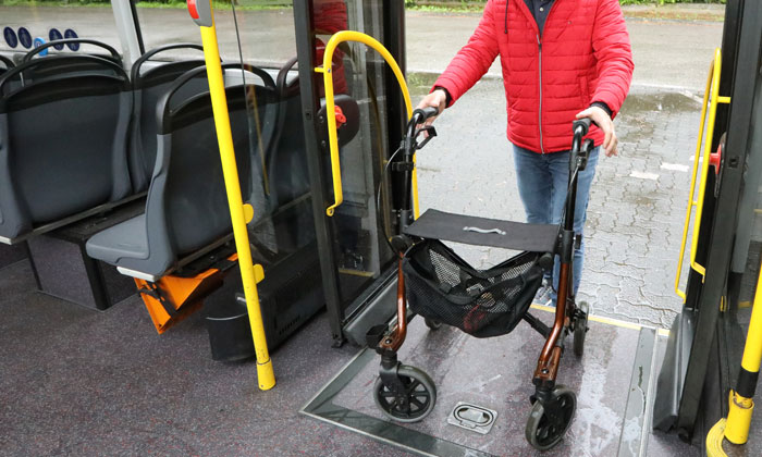 1. Stehen Sie erst auf, wenn der Bus angehalten hat. Nehmen Sie dann Ihren Rollator und fahren Sie rückwärts bis unmittelbar vor die Tür. Sie vermeiden so, dass der Rollator vornüber aus der Tür kippt. Stellen Sie dort die Bremsen fest.