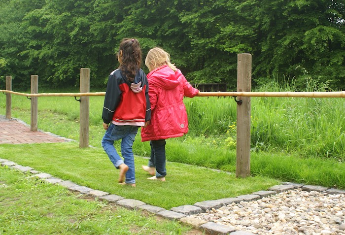 Wie fühlen sich unterschiedliche Untergründe an, wenn man barfuß auf ihnen geht? Auf einem Tastpfad im Naturerlebnisgarten kann man ohne Schuhe diese Gefühle erleben. Statt die Wahrnehmung von den Augen leiten zu lassen, hält man sich am Geländer fest und spaziert über Gras, Steine und andere Elemente.