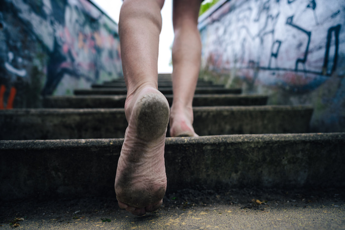 Probleme mit Dreck hat er nicht, besonders gern mag er das Gefühl von Matsch zwischen den Zehen. „Wie andere sich die Hände waschen, wasche ich mir zuhause sofort die Füße“, sagt Hombach. Nur vor Scherben hat er etwas mehr Respekt. Zwar hat Hombach durch das viele Barfußgehen eine eher unempfindliche Lederhaut entwickelt. Doch die ganz kleinen Scherben muss er häufiger aus dem Fuß ziehen, wenn er seine Freiheit an Orten gespürt hat, wo andere am Wochenende feierten.