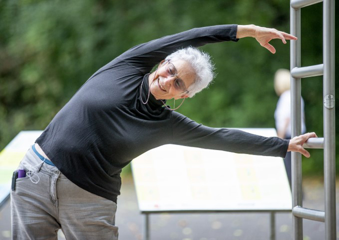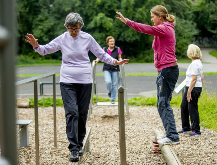 Zwanzig Teilnehmer gehören zum Kurs von Irmgard Otto, einem Angebot des SeniorenNetzwerks Porz-Zündorf. Einige der Sportler sind über achtzig, aber auch eine 41-Jährige ist dabei, die den herzlichen Umgang in der Runde, die frische Luft und die sportliche Betätigung schätzt. Die Teilnehmer profitieren von Ottos Erfahrung als Dozentin an der Deutschen Sporthochschule Köln. Sie führt die Gruppe von einer Station zur nächsten, gibt Tipps, erläutert die Geräte, korrigiert manchmal die Körperhaltung und spornt an.