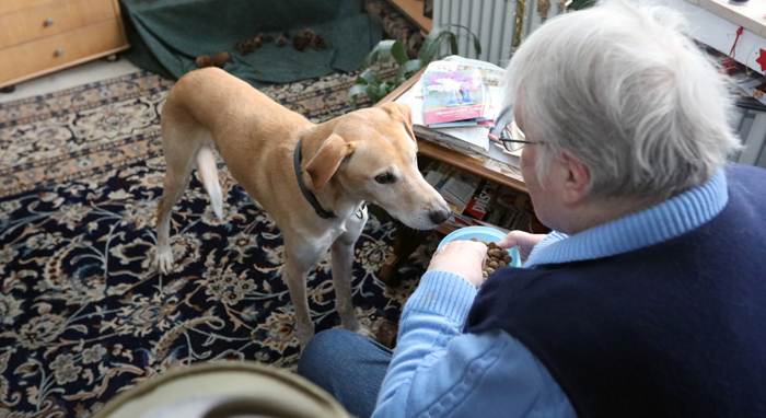 Zur Begrüßung ein Leckerchen. Wenn Rufus bei Frau E.zu Besuch ist, gehört ihr seine ganze Aufmerksamkeit. Foto: René Denzer