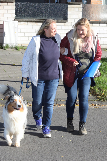 Es folgen weitere Übungen, bei denen das Zusammenspiel von Mensch und Tier beobachtet wird. Etwa wie der Australian Shepherd sich verhält, wenn er angeleint wird und seine Besitzerin sich entfernt. Hier wirkt der Vierbeiner etwas gestresst. Hampel gibt dazu Tipps und Hilfestellung. Später mimt die Hundetrainerin eine ältere Dame, die von Petra Haack und Blue begleitet über die Straße stolpert. Erschrickt das Tier vor den unkontrollierten Bewegungen? Nein, Blue bleibt gelassen. Ein Pluspunkt, den Hampel auf einem Notizblock vermerkt.