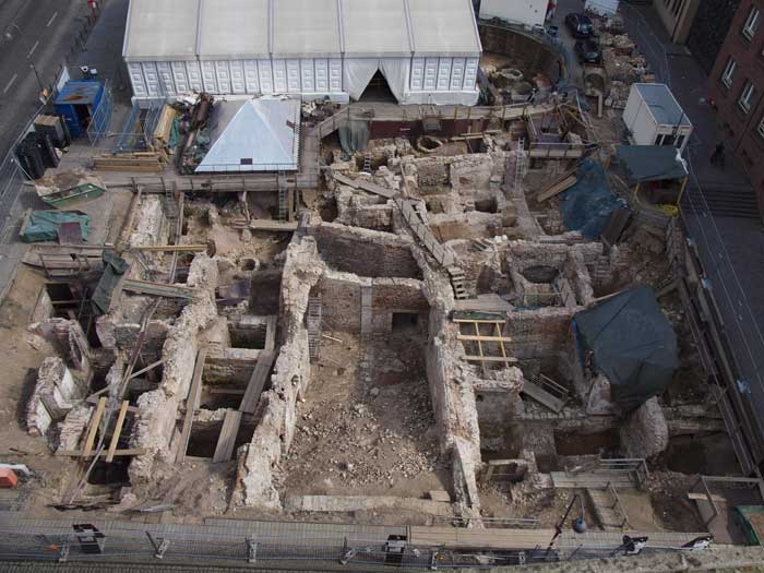 Ausgrabungen vor dem Historischen Rathaus, darüber entsteht das MiQua. Foto: Stadt Köln, Christina Kohnen