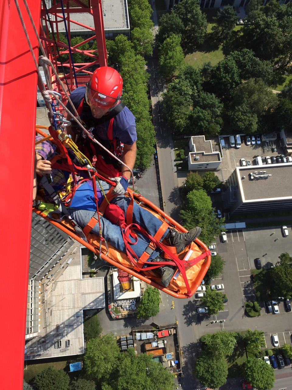 Und diese Grenzen liegen nicht nur in der Höhe, sondern auch in der Tiefe. Nicht nur wenn ein Bauarbeiter auf einem hohen Baugerüst einen Herzinfarkt erleidet, wenn ein Kranführer in seiner Kabine einen Schwächeanfall bekommt, ein Fensterputzer in seiner Gondel oder ein Paragleiter in einem Baum festhängt, sondern auch wenn ein Arbeiter beim Bohren eines Brunnens in einen tiefen Schacht gefallen ist, dann ist das Höhenrettungsteam zur Stelle.