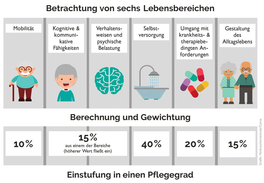 Diese beinhalten die Mobilität, kognitive, kommunikative, selbstversorgerische und alltägliche Fähigkeiten, die psychische Belastung und den Umgang mit krankheits- und therapiebedingten Anforderungen. Er vergibt Punkte nach einem komplexen System, die dann in unterschiedlicher Gewichtung in die Berechnung des Pflegegrades einfließen.