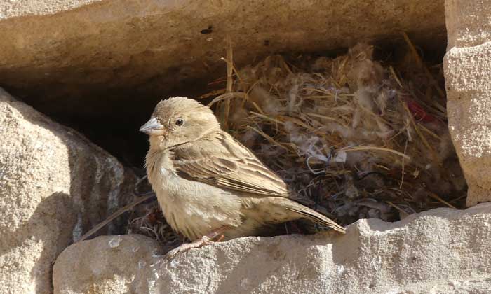 Spatzen sind Gebäudebrüter. Wer genau hinschaut, sieht sie auf Mauernischen und auf Vorsprüngen nisten. Foto: Betina Küchenhoff