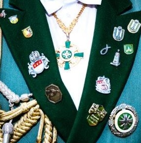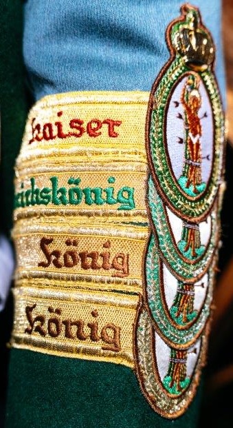 Estes Foto: Der Vogel wurde von Jan Wellem 1711 gestiftet. Zweites Foto: Eine alte Tradition, die auch durch besondere Abzeichen an der Kleidung sichtbar wird. Fotos: Costa Belibasakis