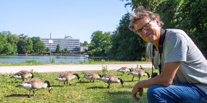 „Es sind viele. Sehr, sehr viele. So achtzig bis hundert“, schätzt Winfried Toedt. Der Vogelexperte des Kölner Stadtverbands des Naturschutzbundes Deutschland e.V. (NABU) steht inmitten einer schnatternden Schar von Kanadagänsen. In aller Seelenruhe watschelt die Gruppe am Ufer des Kahnweihers im Stadtwald entlang. Ungerührt überqueren die Tiere den Fußweg, die schwarzen Hälse auf der Suche nach Gras nach unten gebeugt. Radfahrerinnen, Jogger, Eltern mit Kinderwagen und ältere Menschen mit Rollatoren weichen aus.