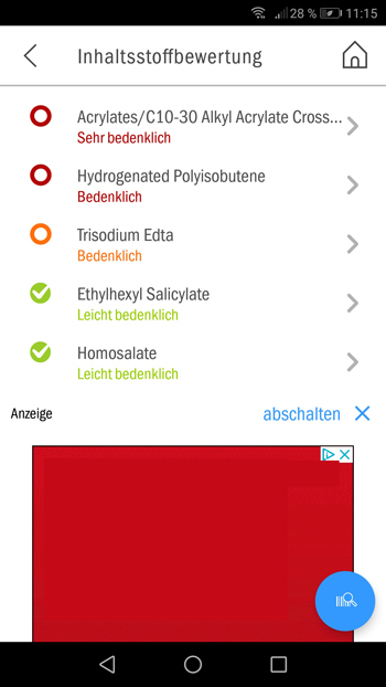 Jeder einzelne Inhaltsstoff wird ausführlich beschrieben. In dem Beispiel wurde der als bedenklich gekennzeichnete Stoff "Trisdium Edta" als Zusatzstoff ausgemacht. Er wird für ein verbessertes Aussehen des kosmetischen Mittels eingesetzt: Trisodium Edta oder auch Edetinsäure genannt, beeinflusst die Farbe und die Konsistenz des Produkts. Unter dem Punkt "Problematik" kann man nachlesen, dass der Stoff die Zellmembran schwächt. Außerdem wird auf eine mögliche Umweltschädigung hingewiesen. In Expertenkreisen ist das jedoch zum Teil umstritten, zumal es aktuell wenig gleichwertige Alternativen gibt. Screenshot (Bildschirmfoto)