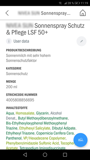Sobald der Strichcode von der App registriert wurde, wird die Kamera deaktiviert. Automatisch erscheint das Produktbild mit einer kurzen Produktbeschreibung auf Ihrem Display. Hier wurde beispielsweise ein Sonnenschutzspray getestet. Screenshot (Bildschirmfoto)
