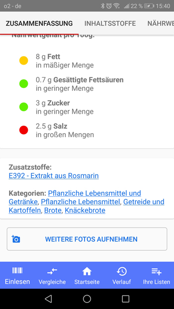 Sobald die App den Code erfasst hat, passiert alles automatisch. Ein kleines Foto Ihres eingescannten Produktes erscheint. Auf der Farbskala sehen sie sofort die Bewertung von Grün (gesund) über orange (mittelmäßig) nach rot (ungesund). Das groß hervorgehobene Feld der Farbskala zeigt Ihnen auf einen Blick, wie Ihr Produkt bewertet wird.