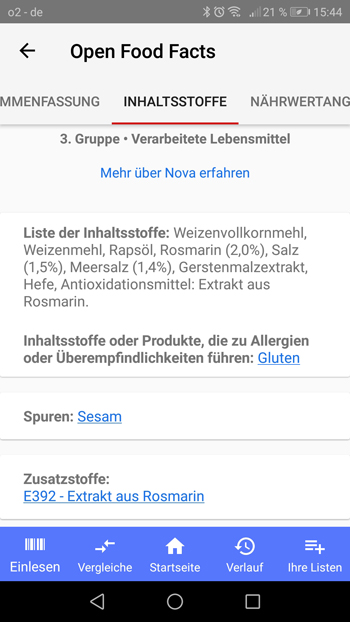 Mit Hilfe der App können auch individuelle Ernährungsgewohnheiten, wie beispielsweise ein vegetarischer oder veganer Lebensstil, berücksichtigt werden. Außerdem können Lebensmittel nach Substanzen untersucht werden, die Allergien auslösen, wie beispielsweise Nüsse, Ei oder Soja. Produkte können sogar auf Unverträglichkeiten wie zum Beispiel Gluten oder Milchzucker getestet werden. Mehr als eine Million Produkte und Zutaten sind bereits erfasst.