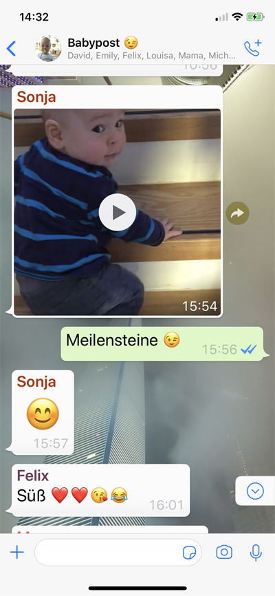 Raphael quietscht vor Vergnügen! Während der acht Monate alte Spross der Familie Neumann aus Poll auf allen Vieren die Treppe zum Obergeschoss erklimmt, filmt ihn seine Mutter Sonja Neumann mit ihrem Smartphone. Die Kamera bedient sie mit „WhatsApp“, einer „App“ (kurz für Applicationsoftware, zu Deutsch: Anwendungssoftware) für Smartphones zum Austausch von Nachrichten über das Internet. Dann schickt sie das Video mit einem Fingertipp in eine ihrer WhatsApp-Gruppen namens „Babypost“. In Bild und Ton können dort nun alle Gruppenmitglieder – in diesem Fall Raphaels Oma und Opa, Tante und Onkel, seine älteren Geschwister und seine Cousins – auf ihren Smartphones den Aufstieg des kleinen Mannes miterleben.