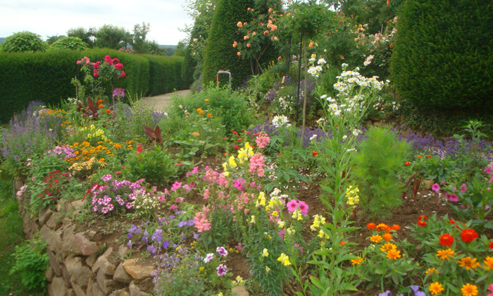 Wen es zurück ins üppige Blühen zieht, der kann im französischen Bauerngarten zwischen typischen Bauernblumen wie Bechermalven, Löwenmäulchen, Fleißigen Lieschen und Ziertabak die auf Spalier gezogenen Birnbäume betrachten. Oder die gefüllte, zartrosa Kletterrose „Kir Royal“, die sich an der Zierlaube emporrankt, begleitet vom Blau der Clematis. In diesem Gartenparadies gedeihen Stauden und Sträucher, Gräser und Gehölze und überall Rosen … Dazu öffnen sich immer wieder Blicke in die blaue Ferne des Westerwaldes oder in den nächsten Gartenraum.