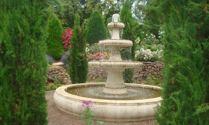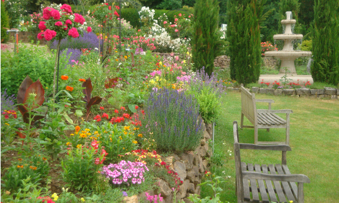Im englischen Garten geht die Rasenfläche übergangslos in die dichte Bepflanzung mit niedrigen, reich blühenden Blumen über. In den Rabatten steigt die bunte Pracht der Stauden höher und höher. Ein römischer Schalenbrunnen zieht die Blicke auf sich. Es rieselt und plätschert leise.