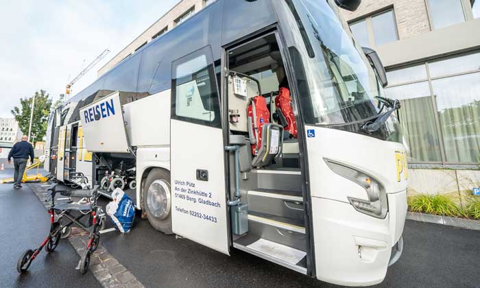 In dem modernen Reisebus kann mit wenigen Handgriffen Platz für Rollstühle geschaffen werden. Zudem gibt es eine Hebebühne. Sie transportiert Linnenberger (76) in ihrem elektrischen Rollstuhl nach oben. Am Platz angekommen, wird ihr Gefährt sicher befestigt. „Das Besondere ist, dass die Gäste im Rollstuhl sitzen bleiben können und dass wir flexibel bei der Sitzaufteilung sind“, erklärt Felix Pütz vom Bergisch Gladbacher Busunternehmen Pütz-Reisen. Von ihm hat das DRK den Bus angemietet.