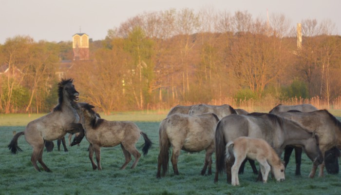 Revierkämpfe unter Wildpferden sind ein Naturschauspiel, das man im Münsterland live beobachten kann. Foto: Cornelia Höchstetter