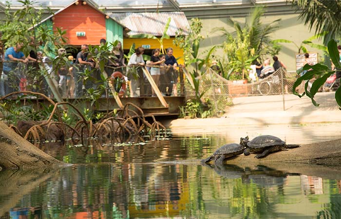 Wem der Sinn weniger nach Entspannung und mehr nach Abenteuer steht, der muss nur ein paar Kilometer über die holländische Grenze nach Arnhem fahren. In Burger’s Zoo laden sieben nachgebildete Lebensräume zur Eintages- Weltreise, vom Regenwald bis zur Steinwüste. Die neueste Attraktion: der belizianische Mangrovenwald. In tropischen Regionen wie Mittelamerika entstehen Mangroven dort, wo Flüsse ins Meer münden. Durch die Gezeiten mischen sich ständig Süß- und Salzwasser – ein extremes Klima, dem nur wenige Pflanzenarten gewachsen sind. Um dem Original möglichst nahe zu kommen, werden im Burger’s Zoo die Gezeiten nachgeahmt: nachts Flut, tagsüber Ebbe.