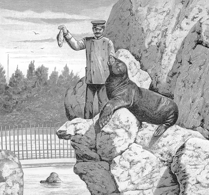 Fangfrisch serviert – dieser alte Kupferstich zeigt eine Seelöwenfütterung. Foto: Kölner Zoo
